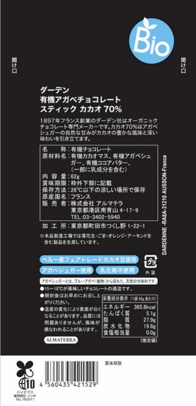 【2025年11月新発売】ダーデン有機チョコレートスティック カカオ70%