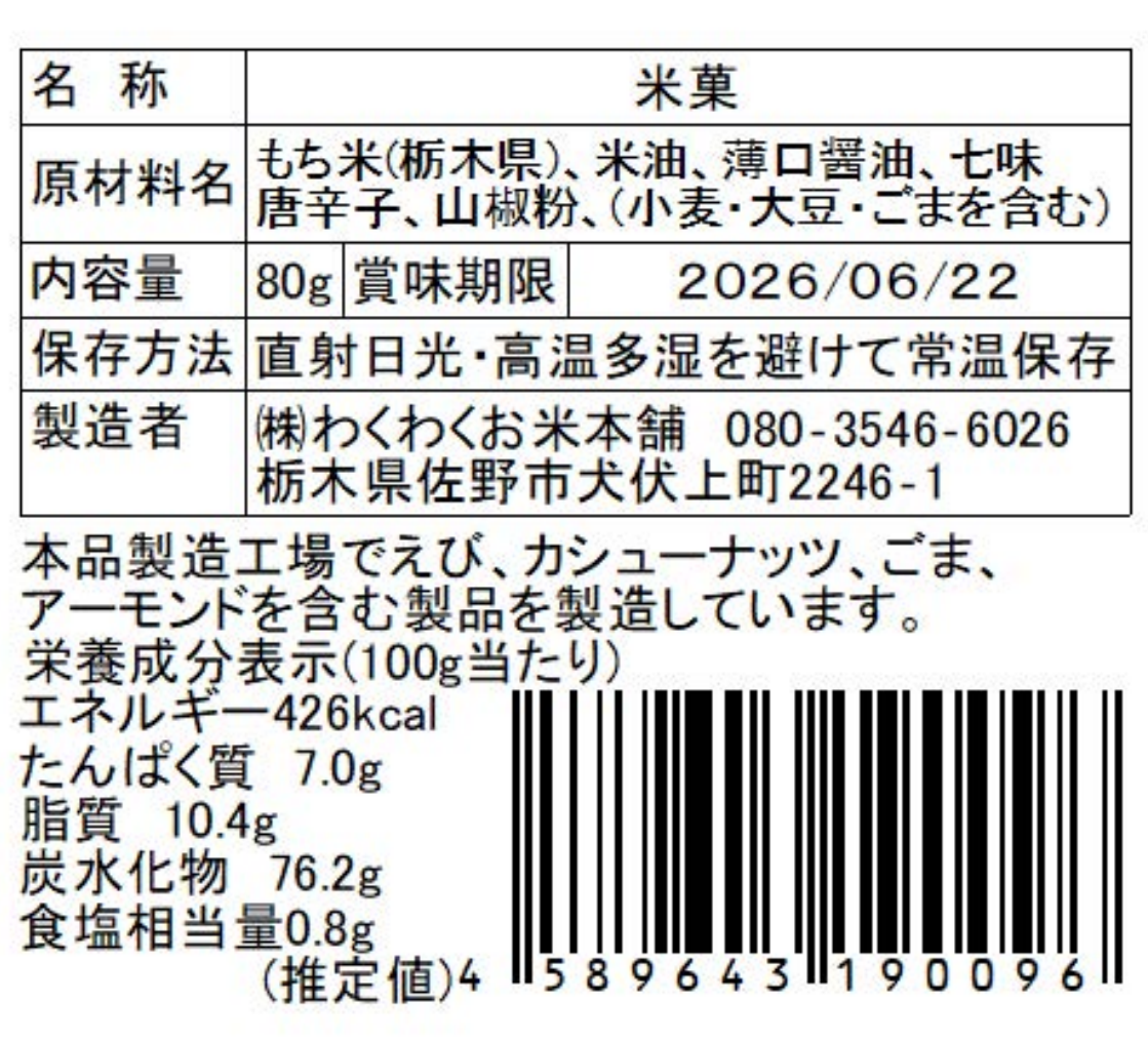 【原材料】もち玄米(栃木県)、米油、醤油、七味唐辛子(唐辛子、陳皮、白胡麻、黒胡麻、あおさ粉、青山椒)、山椒粉(花椒、山椒)