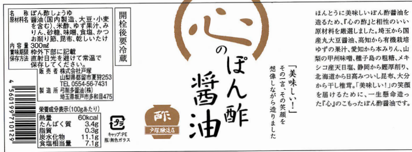 【原材料】醤油、醸造酢(心の酢)、ゆず果汁(高知産)、みりん、粗糖(鹿児島産)、味噌、食塩、かつお削り節(静岡産)、昆布(北海道産)、乾しいたけ(大分産)